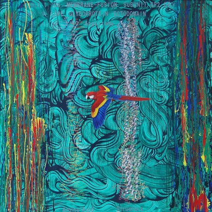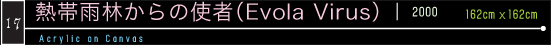 公募広島の美術入選(広島現代美術館・広島市) 縦長に描かれているのは、 Evola_Virusのエンベローブ・タンパク質の分子構造モデルである。 捩れたひものような構造をもつ,この単純な生物は、 人間の生命をいとも簡単に破壊してしまう.